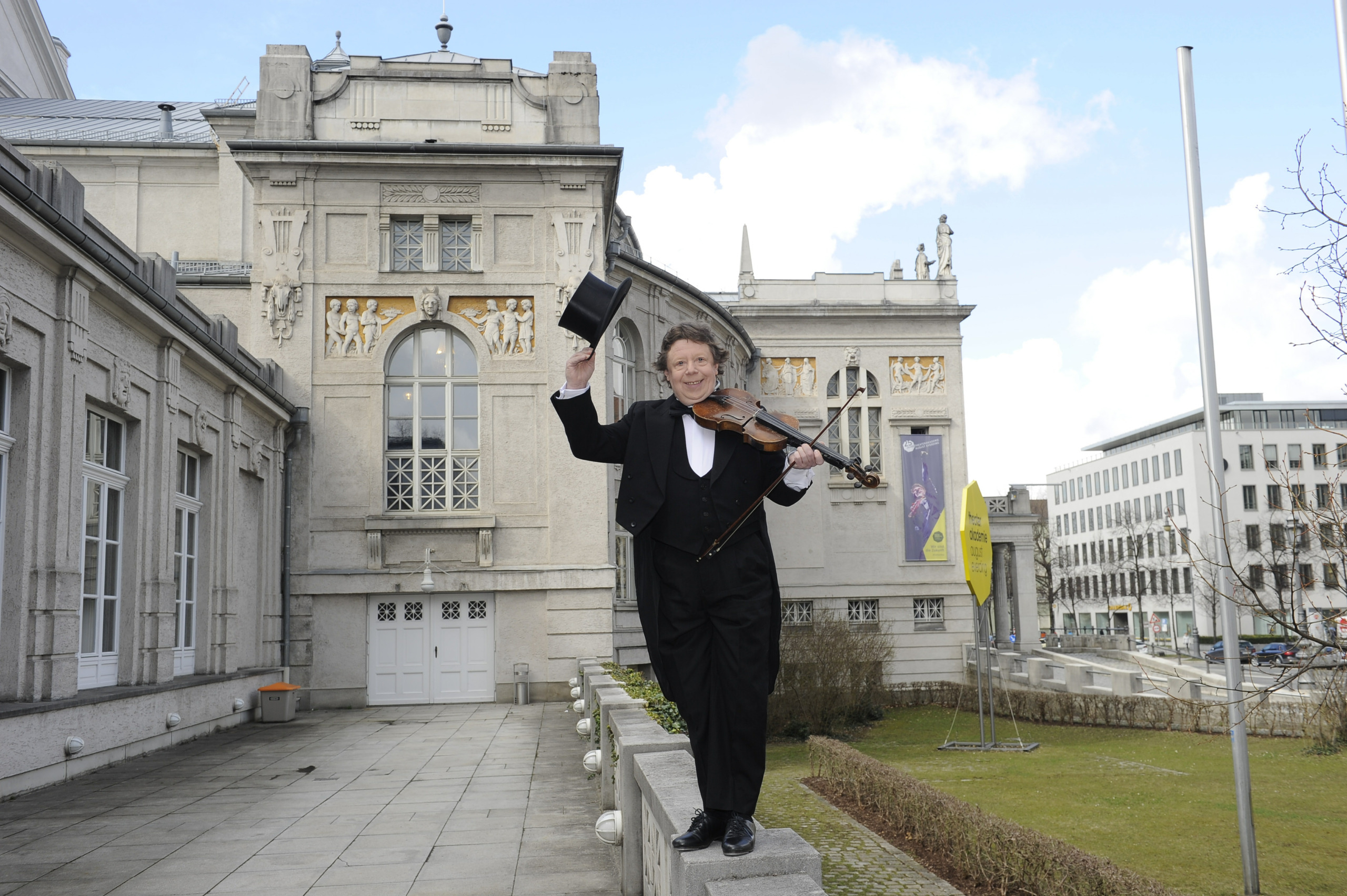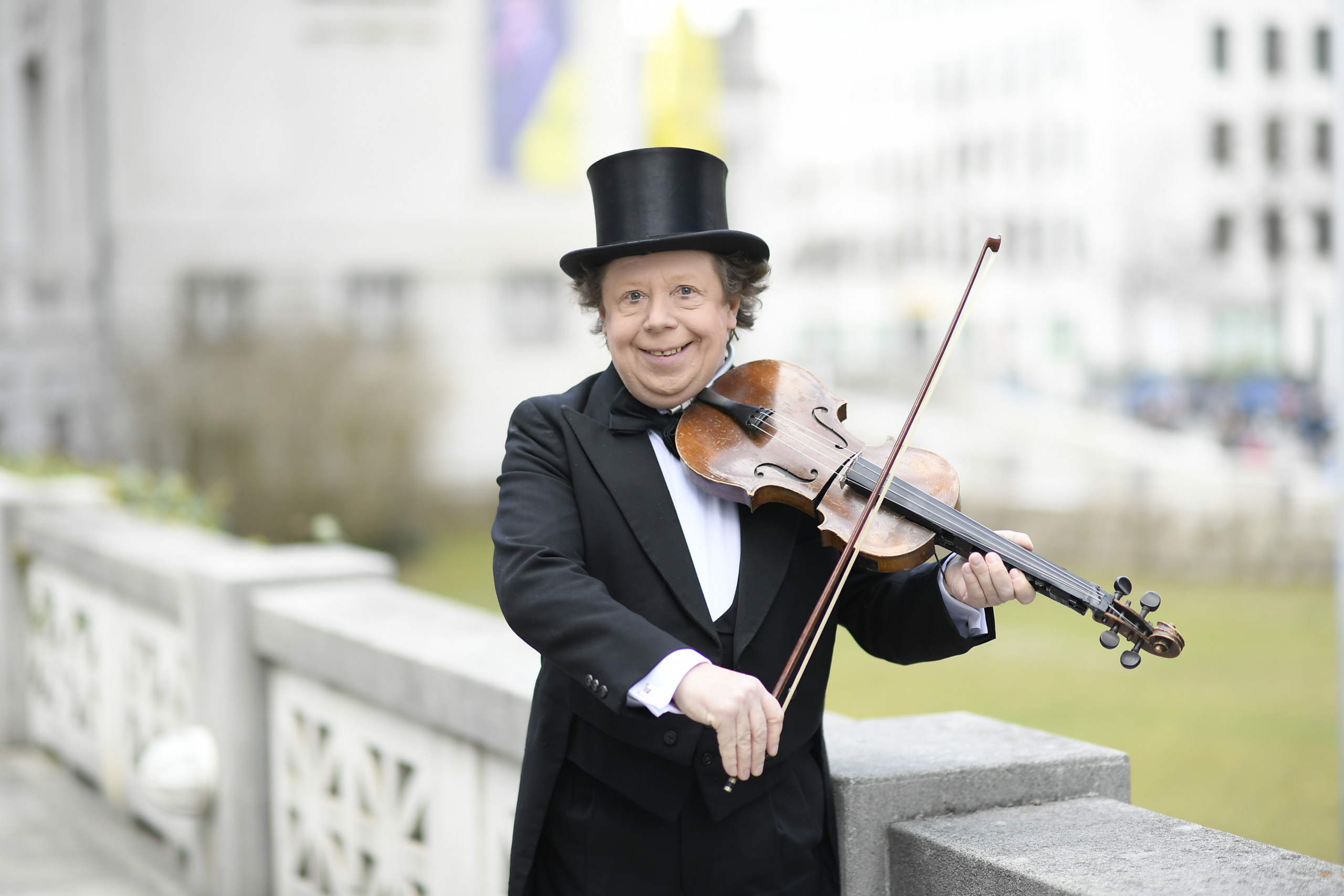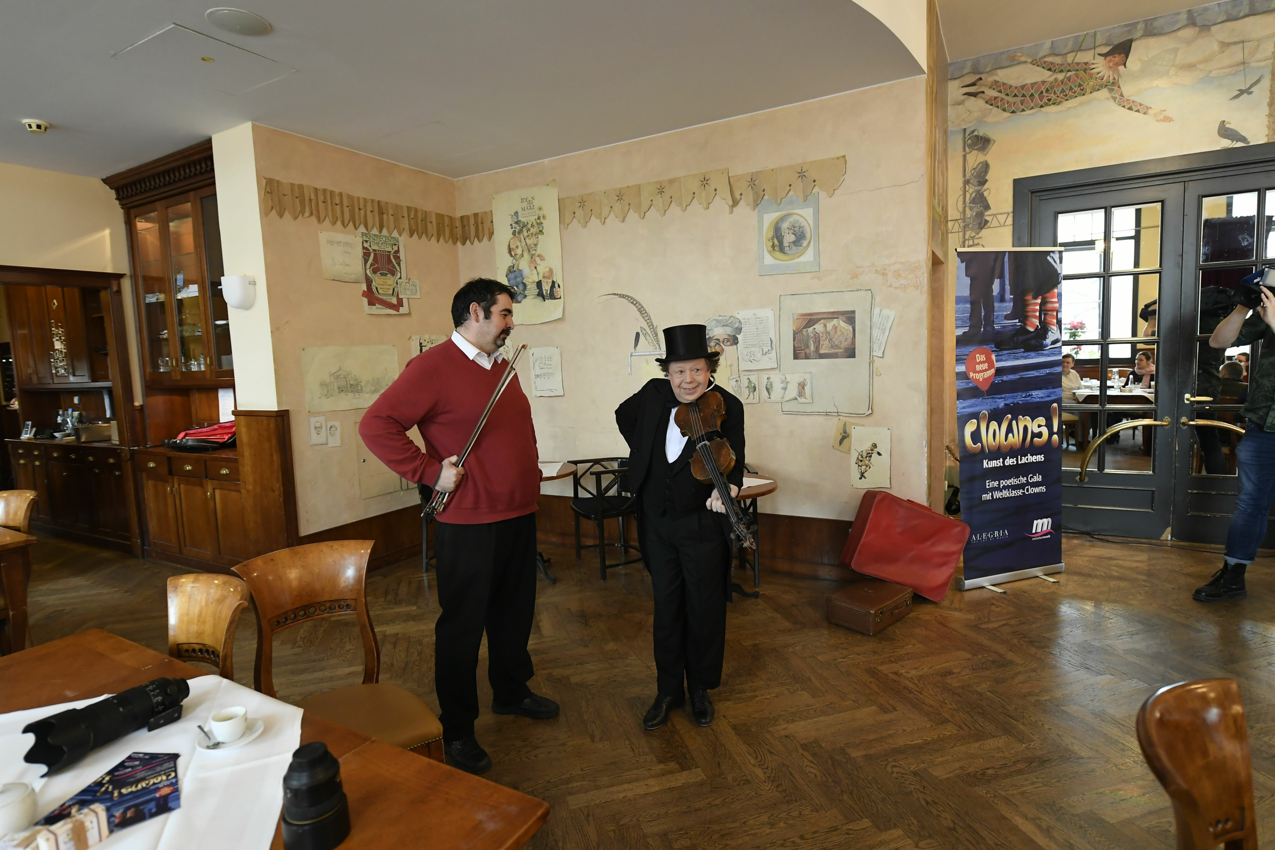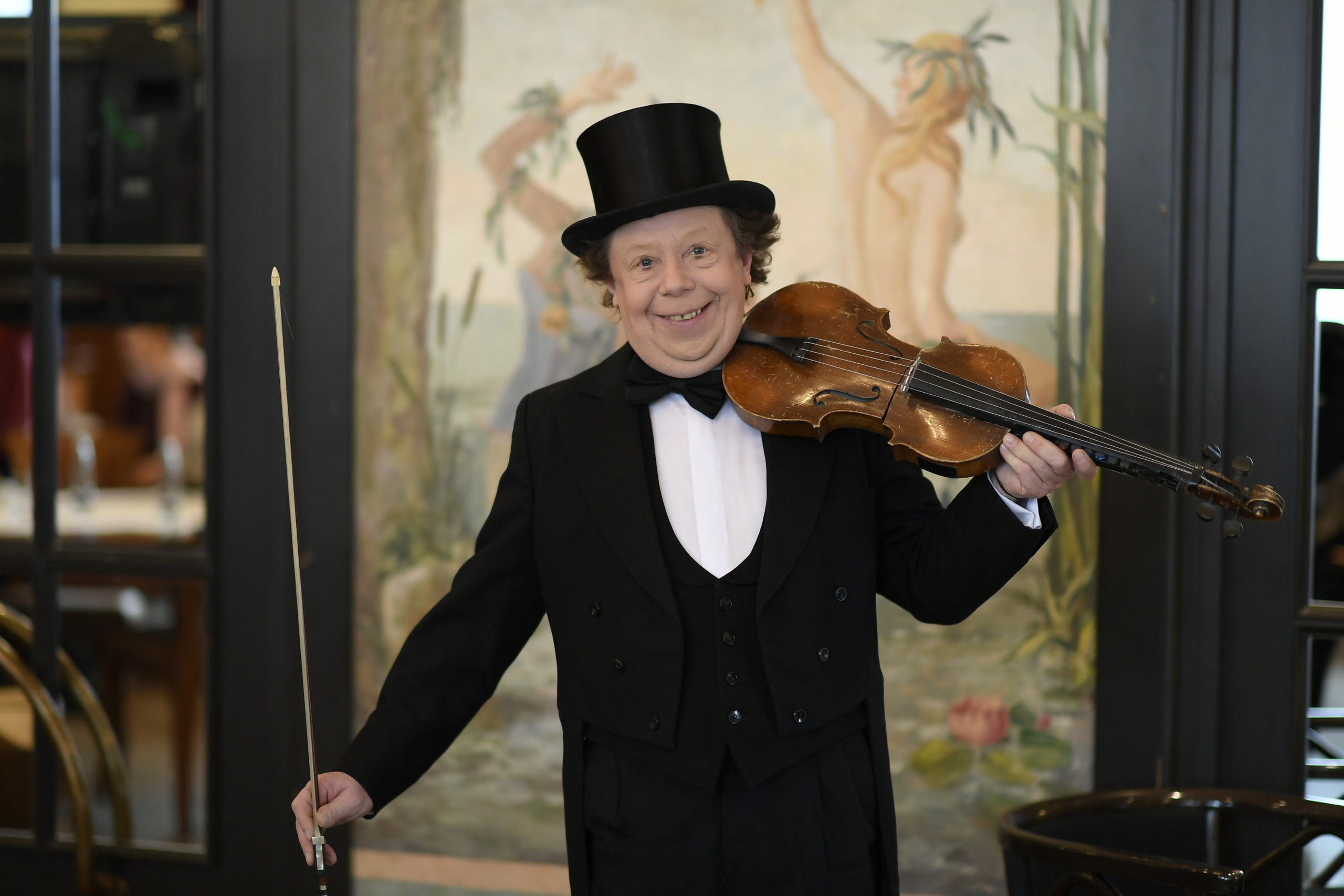 Ich sitz da und denke mir nur: ‚Hoffentlich ist die Show nicht genauso „lustig“.‘ Mitten im Satz bestellt sich Lutz Weber einen neuen Kaffee beim Ober. ‚Na das kann ja lustig werden …‘ – Es sind nicht mal fünf Minuten um. Das wird eine lange Stunde. Während ich das noch denke, kommt ein untersetzter Herr mit Zylinder und Geige hinter dem Thresen hervor. Mit Fliege und schwarzem Anzug wirkt er zwar etwas overdressed, aber nicht unbedingt bei dieser Location deplatziert. Es ist Sergej Maslennikov und zeigt einen kleinen Vorgschmack auf seine Künste.