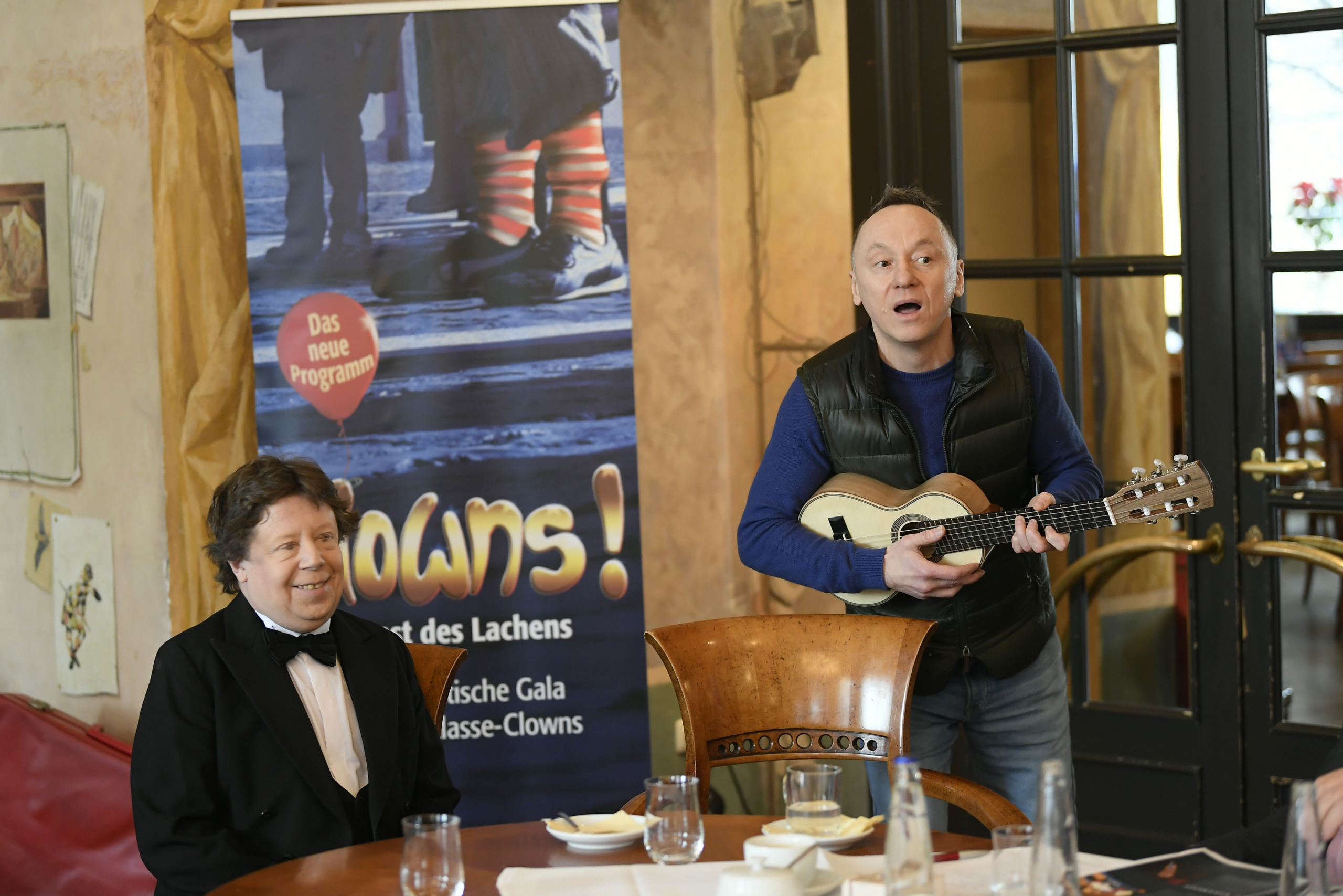 Die Szenerie bei der Pressekonferenz im Cafe des Prinzregententehaters in München wirkt im ersten Moment eher wie eine komplett trockene Angelegenheit. Drei Männer sitzen an einem Tisch. Keine weißen Gesichter, keine rote Nase, kein Quietschen. Davor Kameras, ab und zu ein Blitz und die Gesichter der Presse. Einige spielen am Smartphone. Ich auch. Es geht los. Zumindest verschwinden die Smartphones. Ab und zu gibt es ein Blitzlicht. Lutz Weber – bei „Clowns“ für die Dramaturgie verantwortlich und gemeinsam mit Joschi Vogel seit fast einem Jahr mit dem Stück beschäftigt beginnt zu reden. Keine große Einführung. Kein was machen wir hier, wer sind wir.